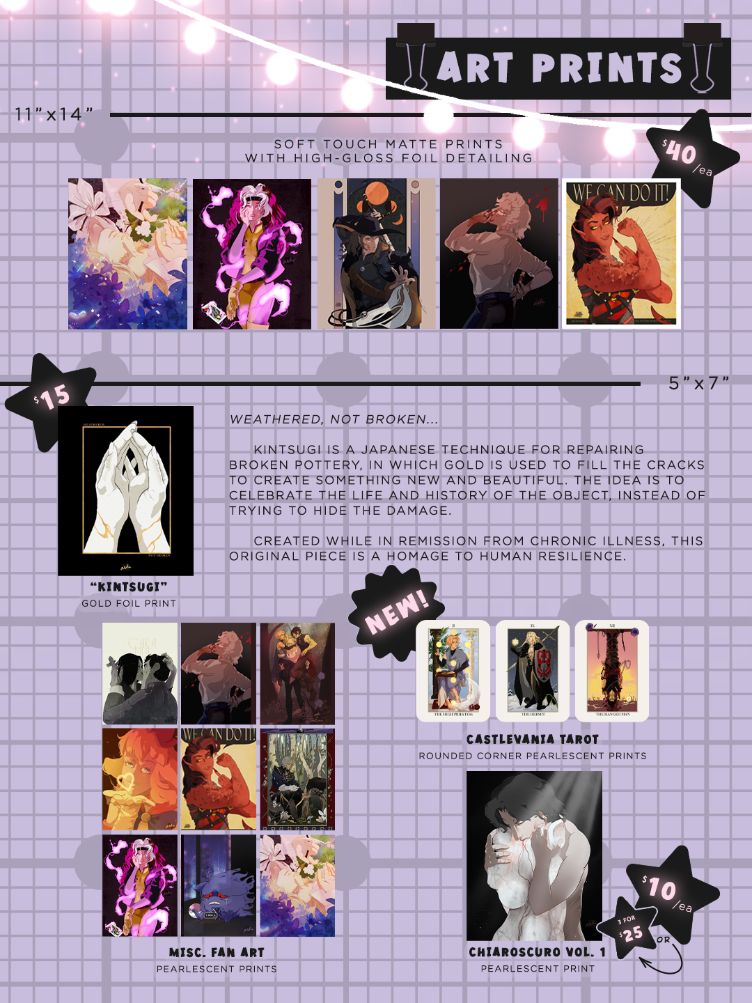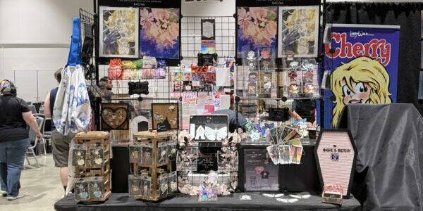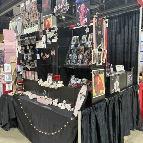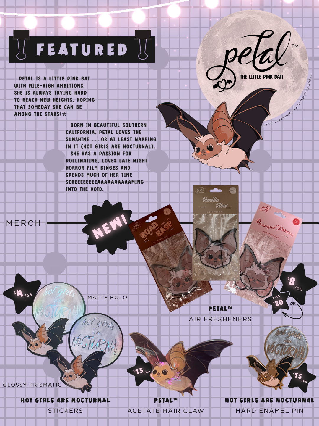 Sophisticated cuteness, with a gothic edge! Designed with the adult otaku in mind, my product line focuses on high quality materials and chic design with subtle nods to fandom and alternative culture–to make a statement with a touch of professionalism. My catalog, containing an even mix of both all-original designs and fan art, offers over 100 products to browse including art prints, enamel pins, stickers and more! Find me easily at your local artist alley–look for the little pink bat soaring above my booth!