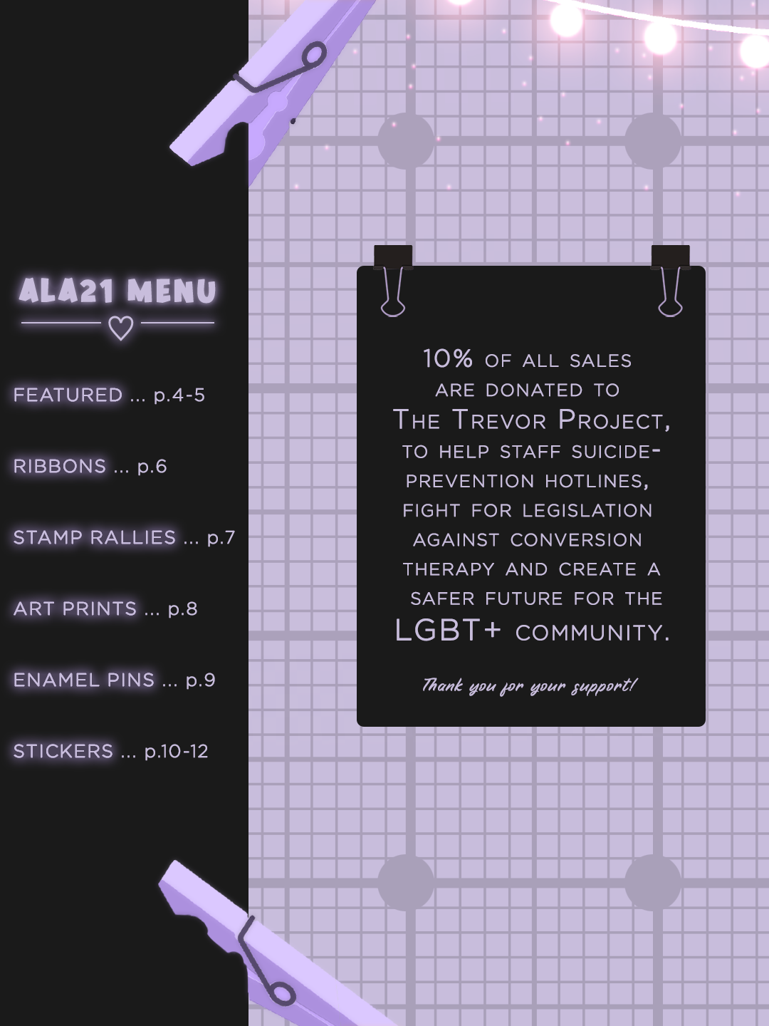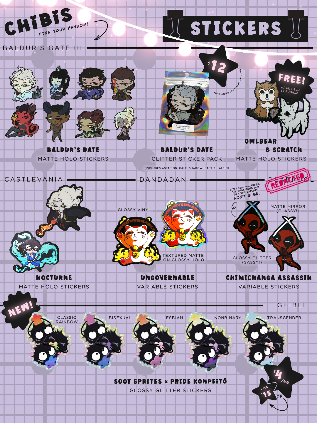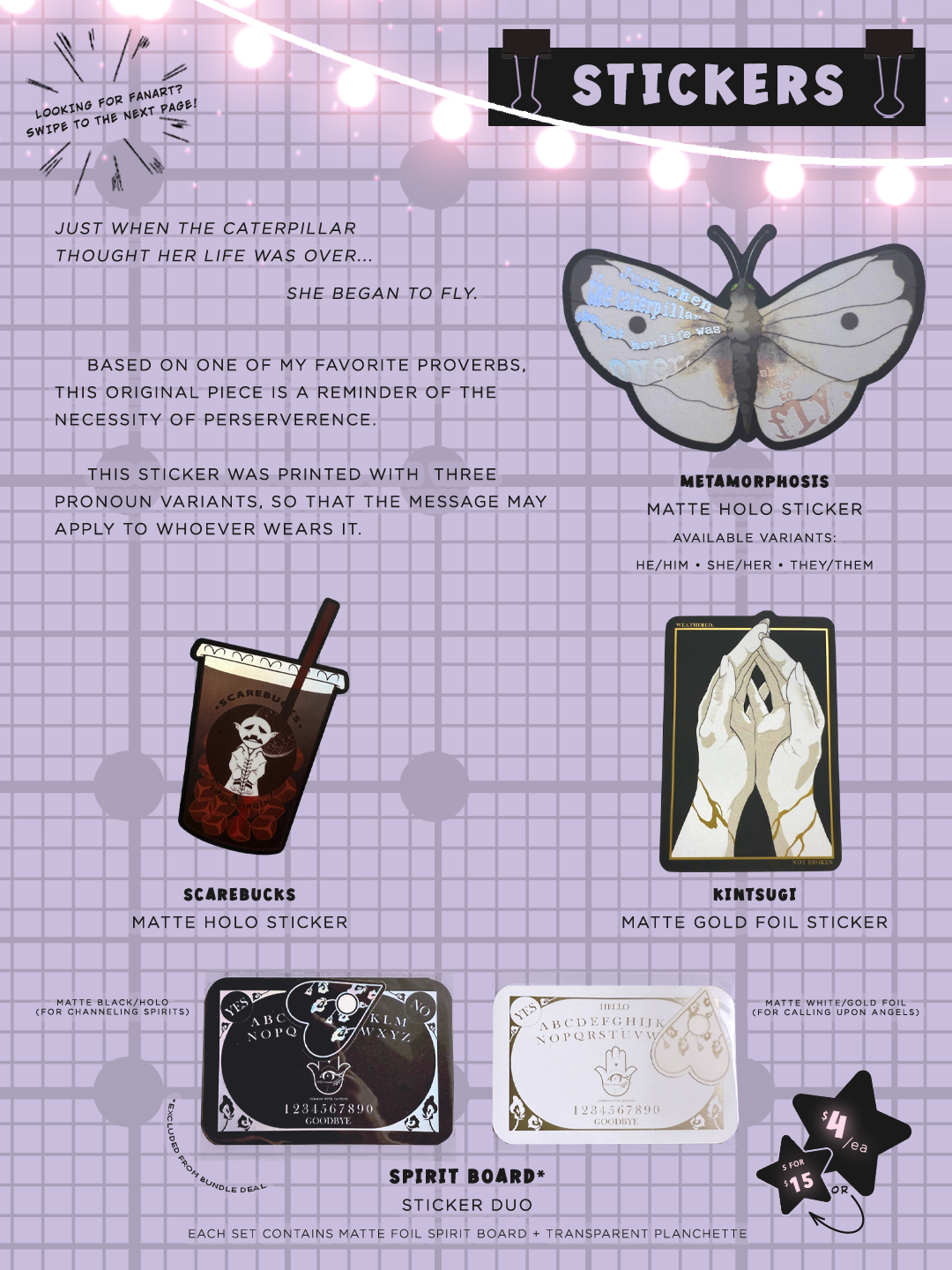 Sophisticated cuteness, with a gothic edge! Designed with the adult otaku in mind, my product line focuses on high quality materials and chic design with subtle nods to fandom and alternative culture–to make a statement with a touch of professionalism. My catalog, containing an even mix of both all-original designs and fan art, offers over 100 products to browse including art prints, enamel pins, stickers and more! Find me easily at your local artist alley–look for the little pink bat soaring above my booth!